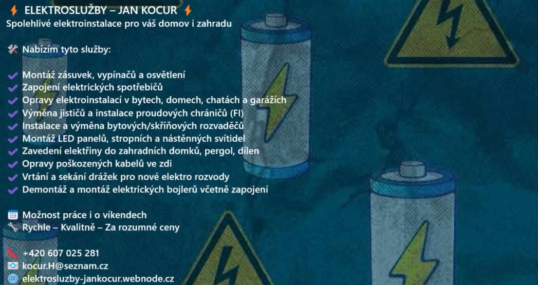 Zabývám se elektroinstalačními pracemi menšího rozsahu. Nabízím rekonstrukce elektroinstalací v bytech, opravy a údržbu stávajících rozvodů. Snažím se poskytovat rychlé a kvalitní služby za dostupné ceny.